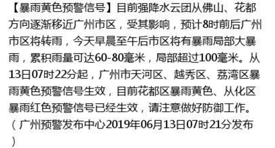 目前强降水云团从佛山、花都方向逐渐移近广州市区,受其影响,预计8时前后广州市区将转雨,今天早晨至午后市区将有暴雨局部大暴雨。从13日07时22分起,广州市区暴雨黄色预警信号生效,请注意做好防御工作。广州市气象台06月13日07时22分发布。
