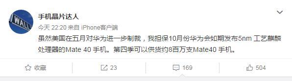业内人士透露,华为会如期在10月发布搭载麒麟1020的华为Mate40系列手机,第四季度的供货量约8百万台。以华为旗舰手机整个生命期2000万台的出货量来计算,首个季度备货800万台并不少。