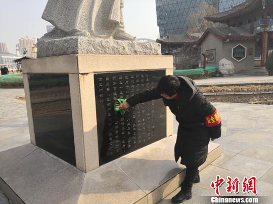 中新网兰州3月5日电 (杨娜)随手拿一块湿毛巾,是兰州水车博览园管理部工作人员郝燕的习惯。5日,做完分内工作的她依旧拿着湿毛巾在博览园巡视一圈,门口的石碑因前几天的雨雪天气溅上了泥点,郝燕仔细将它擦拭干净。