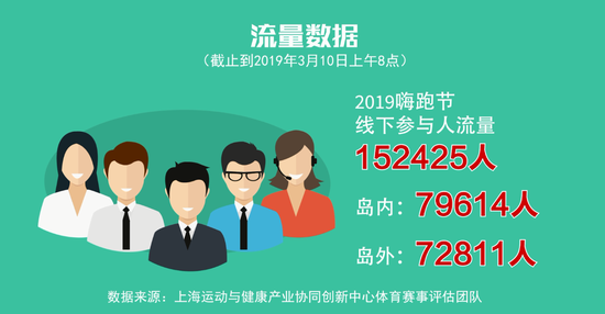 2019嗨跑节线下参与人流量:152425人(15.24万人),其中岛内人流量79614人,岛外人流量72811人。