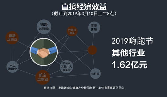 2019嗨跑节为其他行业带来共计1.62亿元的直接经济效益,其他行业包括铁路、道路、水上、航空运输业、社会及其他个人服务、信息传输、计算机服务和软件业。