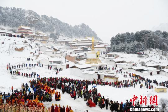 图为甘南碌曲县郎木寺镇正月大法会上的晒佛仪式。(资料图) 杨艳敏 摄