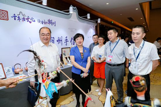 现场节目精彩纷呈,“凤城之光”光影秀主题曲《潮州人》、潮剧表演《秋风秋雨寄柔情》、潮州《工夫茶茶艺二十一式》等具有浓厚潮味的节目,让在场观众近距离接触地道潮州文化。在“潮州非遗”展示区,手拉壶、铁枝木偶、大吴泥塑,工夫茶文化等非遗技艺传承人在现场展示技艺表演;“潮州手信”展示区展示了潮州三宝、潮州小食、潮州铜艺制品、潮州麦秆画、潮州创意日历等艺术品,玲珑满目的潮州文创艺术,让现场观众目不暇接、赞叹不已。来宾们品尝潮州美食小吃,品味潮州工夫茶,观看并体验潮州非遗文化表演,现场氛围活跃浓烈。