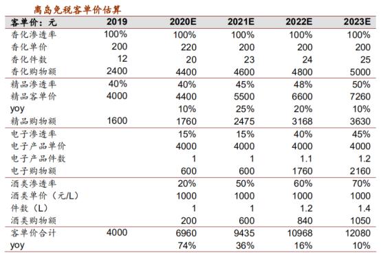 2019年离岛免税客单价约4000元,据招商证券测算,2020年、2021年、2022年、2023年将增加至6960元、9435元、10968元、12080元,增速分别为74%、36%、16%、10%。增速较快。