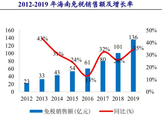 2012年海南免税销售额仅为23亿元,2019年已经增长至136亿元,七年增长491%。