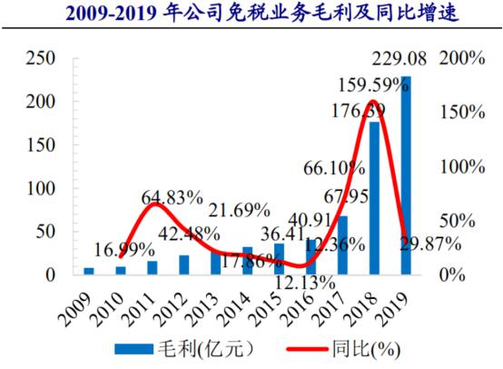 免税业务11年间毛利增幅高达 27倍,成长性惊人。由于免 税业务具有高毛利、高增长的特点,公司自 2014 年开始全面发力免税业务,2017-2018 年相继并购日上(中国)和日上(上海),成就行业霸主地位。公司免税业务收入从 2009 年的 22亿元增长至 2019 年的 458 亿元,累计增幅近 20 倍;毛利也从 8 亿元增长至 229 亿元,累计增幅更是高达 27 倍以上。