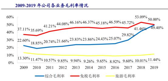 2015-2019 年公司综合毛利率分别为 24.43%、25.07%、29.82%、41.46%、49%。其中,免税业务毛利率分别为 45.18%、46.59%、45.72%、53.09%、50%,旅游业务毛利率分别为 9.65%、8.92%、9.6%、10.01%、11.44%。