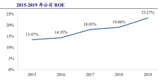 2015-2019 年,公司 ROE 分别为 13.47%、14.35%、18.03%、19.05%、23.29%。对公司来说,ROE 提升主要与净利率提高有关,资产周转率和权益乘数基本保持相对稳定。未来,除了继续提高净利率水平外,公司也可以通过提高经营管理水平加快周转率提升、适当提高财务杠杆增加权益乘数,来保持较高水平的 ROE。