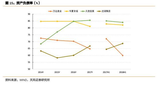 从盈利能力看:万达商业在17年开始有所下滑,净利润从16年的328.85亿元,下滑至17年的219.91亿元,而天房发展在16年出现亏损,亏损额为2.48亿元,17年虽然扭亏为盈,但是整体盈利能力仍然不强,龙湖和华夏幸福近年来净利润表现较为稳定,17年同比改善明显,创近四年来的新高。华夏幸福和万达商业的净资产收益率近年来持续下滑,华夏幸福的ROE从14年的43%下滑至17年的28%,而万达商业的ROE从14年的19%下滑至17年的9.4%,从2014至2017年,龙湖的ROE均保持在15%以上,龙湖和天房17年的净资产收益率均较16年有所提升,但是天房的净资产收益率在4家公司中表现最弱,近年来基本都在5%以下,盈利能力不强。