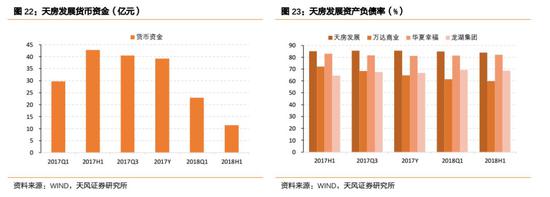 从2017年第三季度,天房发展的货币资金就有所下降,截止18年半年度,公司账上的货币资金仅11.5亿元,然而相较于万达商业、龙湖地产和华夏幸福而言,天房发展的债务率却较高,对外部融资的依赖性大。