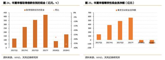 华夏幸福2018年第一季度取得借款收到的现金同比下滑28%,筹资性现金流也由上年同比的净流入转为净流出,净流出额达到68.34亿元,18年上半年度的筹资情况进一步弱化,取得借款收到的现金为170.9亿元,同比下降36%,筹资性现金流净流出97亿元。