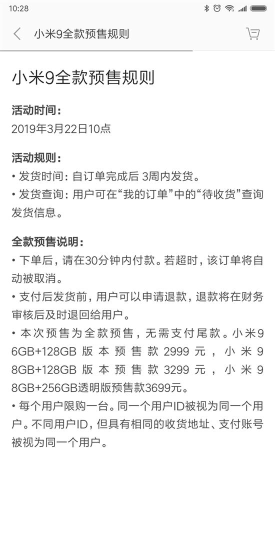 3月22日上午10点,小米9开启全款预售,这是小米9自发售以来第一次在小米商城接受全款预订。小米公司小爱运营总监黄龙中介绍,小米9可直接加入购物车、支付全款,三周发货。