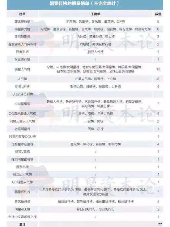 据“明星资本论”的不完全统计,各大互联网社交平台上需要打榜的明星榜单大概有77个。短视频软件都有明星专属板块,QQ粉丝群有定时签到打榜,微博设有虚拟送花,地图软件也会利用粉丝效应带你做任务追星。娱乐圈在互联网上的生态氛围整体都很畸形,一面打击暗地里的偷换数据,一面各类平台又在明面上进行不健康的赌博。
