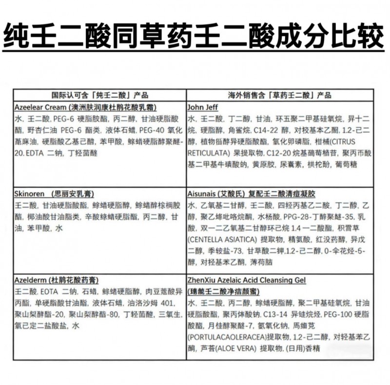 它们并没含有草药或植物,壬二酸,用的是纯化学壬二酸。纯壬二酸是经过近50年临床验证的有效成分,具有祛痘祛斑功能且安全性高。其来源包括纯壬二酸本身或由油酸臭氧分解生成,成分单一,无额外植物提取物添加。