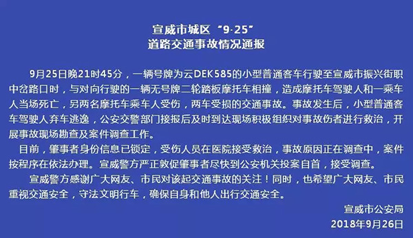 26日15时许,宣威市公安局对外通报称:9月25日21时45分,一辆号牌为云DEK585的小型普通客车行驶至宣威市振兴街职中岔路口时,与对向行驶的一辆无号牌二轮踏板摩托车相撞,造成摩托车驾驶人和一乘车人当场死亡,另两名摩托车乘车人受伤,两车受损的交通事故。