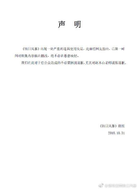 对此,片方回应称,确实存在误用。片方表示,“《蚀日风暴》出现一处严重的道具使用失误,此前经网友指出,已第一时间对剧集内容做出删改,绝不存在恶意映射。我们在此对于给公众造成的不必要困扰道歉,尤其对赵本山老师诚恳道歉。”