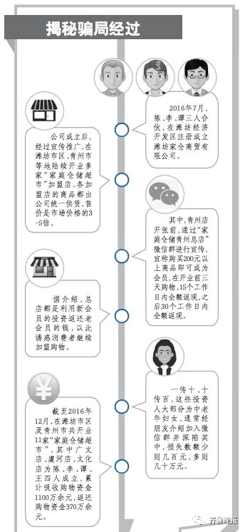 据统计,2016年7月-12月,在潍坊市区及青州市共开业11家“家庭仓储超市”,其中广文店、虞河店、文化店为陈、李、谭、王四人成立,累计吸收购物资金1100万余元,返还购物资金370万余元。