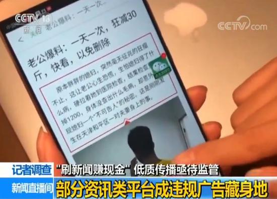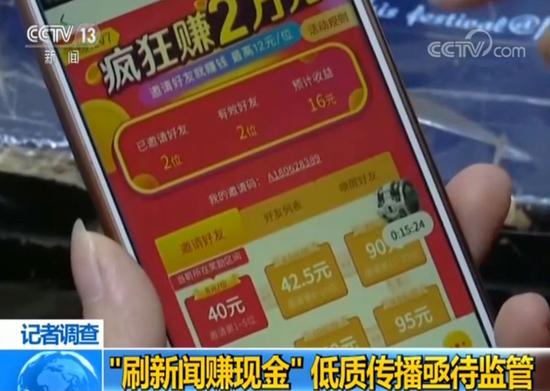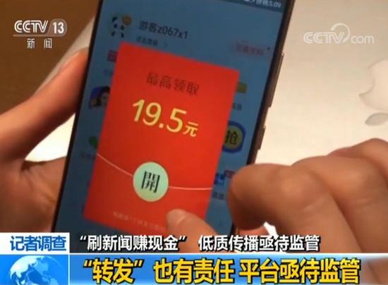 刷刷新闻,转转好友,每天就有进账。央视记者连日来调查发现,一批资讯类平台和应用打出“刷新闻赚现金”的噱头,以现金补贴鼓励用户阅读、转发并推荐好友下载,看似收获了用户时长和忠诚度,却由于传播内容的低俗、低质,侵害了消费者的利益,甚至触碰了法律的底线。