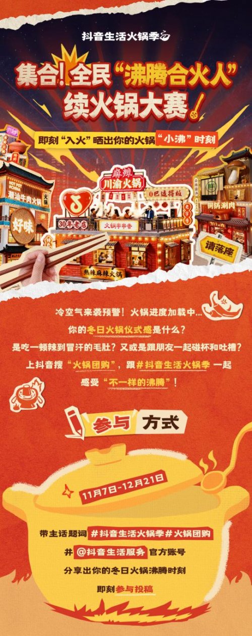 光是分享最爱的火锅店还不够?吃火锅的每一个快乐瞬间都值得被记录!「抖音生活火锅季」懂大家吃火锅时的意犹未尽,于是特别发起全民“沸腾合火人”续火锅大赛,为大家的畅吃续“沸”。快上抖音分享出你的“真香”火锅名场面吧,无论是“馋哭隔壁桌”的C位锅底,还是独家秘制的隐藏吃法,又或是和好友抢肉时爆笑的翻车现场……11月7日至12月21日,上抖音晒出你的“冬日火锅沸腾时刻”,带话题词 #抖音生活火锅季、#火锅团购 并@抖音生活服务 官方账号,即有机会瓜分上万DOU+流量奖励,赢品牌拍摄神器!快来参与投稿,边和云搭子们吃火锅,边收获额外“小沸”惊喜!