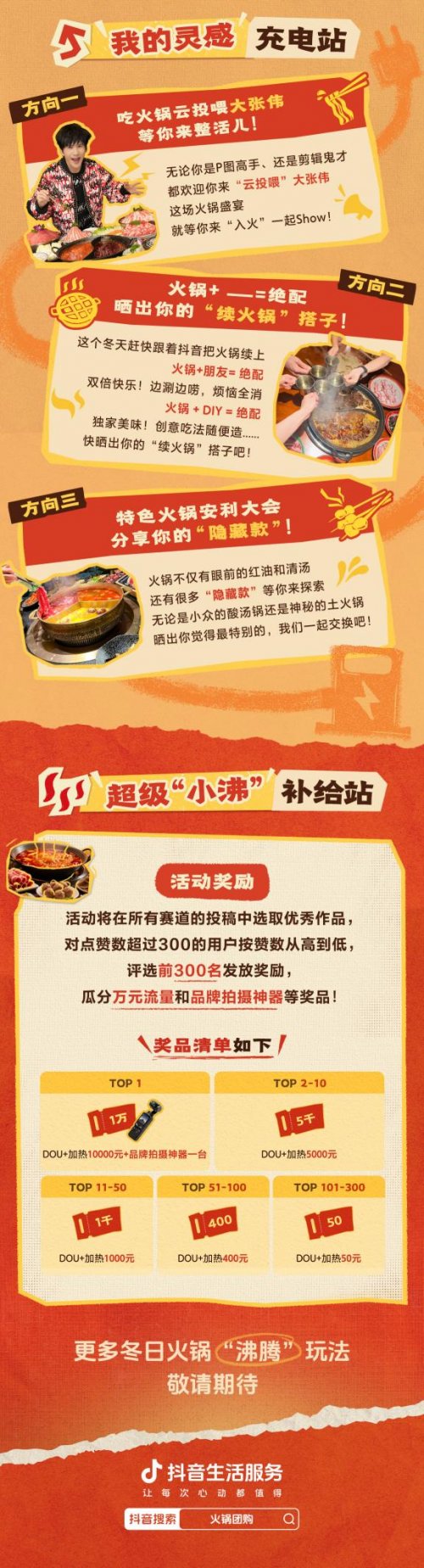 除了创作者专属激励,还有超多“嗨吃”惊喜等你解锁。本次「抖音生活火锅季」携手代言人大张伟、品牌商家及一众达人带来多重福利,让大家畅吃更尽兴。活动期间,上抖音搜索「火锅团购」,一系列福利玩法让你的火锅局“倍儿爽”!不仅搜索后有机会触发明星互动彩蛋赢签名照,还能在线下与大张伟“合拍”互动,边吃边玩超开心!实现“火锅自由”当然也离不开实实在在的“补贴”:主会场火锅券包每天10点限量开抢,最高可领70元,用券嗨吃快乐翻倍!还有超多火锅大牌商家带来的超值尖货等着你,这波吃爽还不伤钱包的机会可千万别放过!