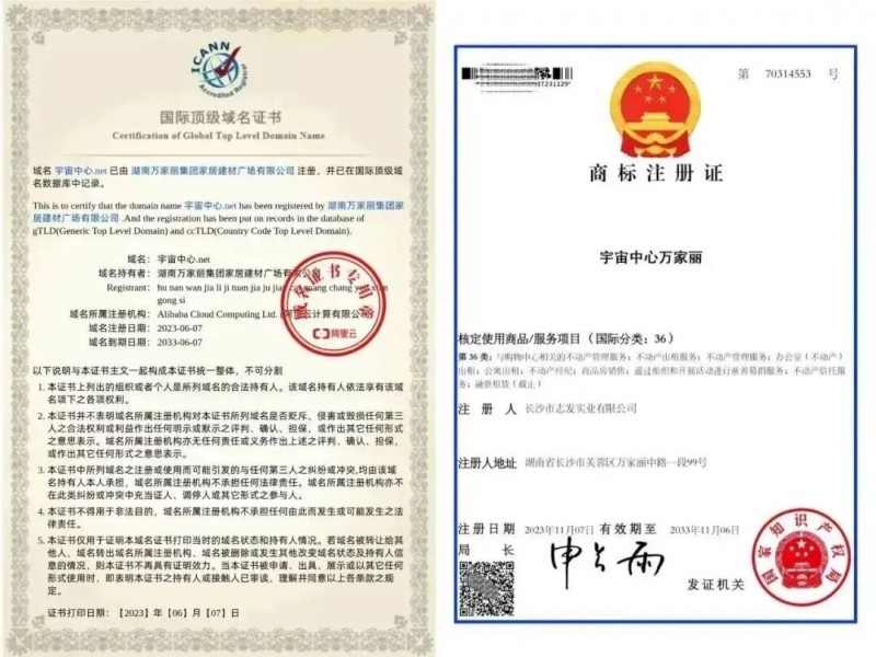 ▲“宇宙中心万家丽”国际顶级域名证书和商标注册证