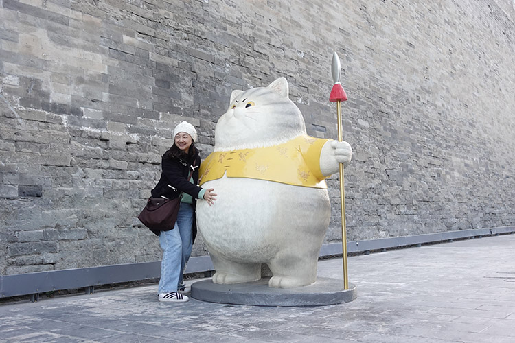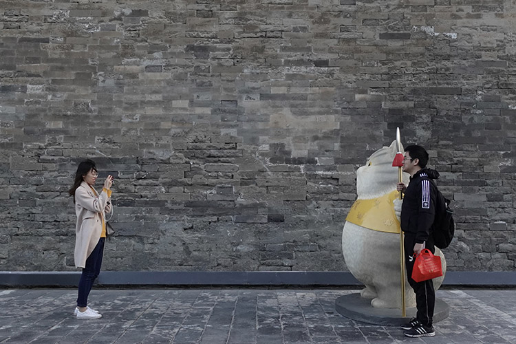 游客来到明代锦衣卫形象“御猫”前亲密合影。